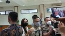 Wulan datang dengan wajah ceria dan dengan tersenyum kepada awak media.