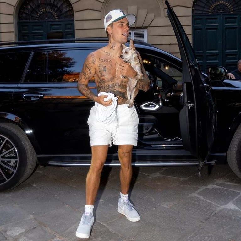 Ia tampil bertelanjang dada, pakai celana pendek dan topi rajut ungu yang mencuri perhatian. (Foto: instagram.com/justinbieber)