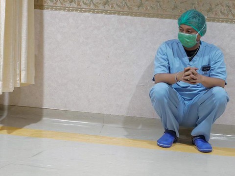 3. Denny Caknan tampak setia mendampingi sang istri selama proses menjelang persalinan. Pelantun 'Nemu' ini bahkan duduk di lantai rumah sakit.